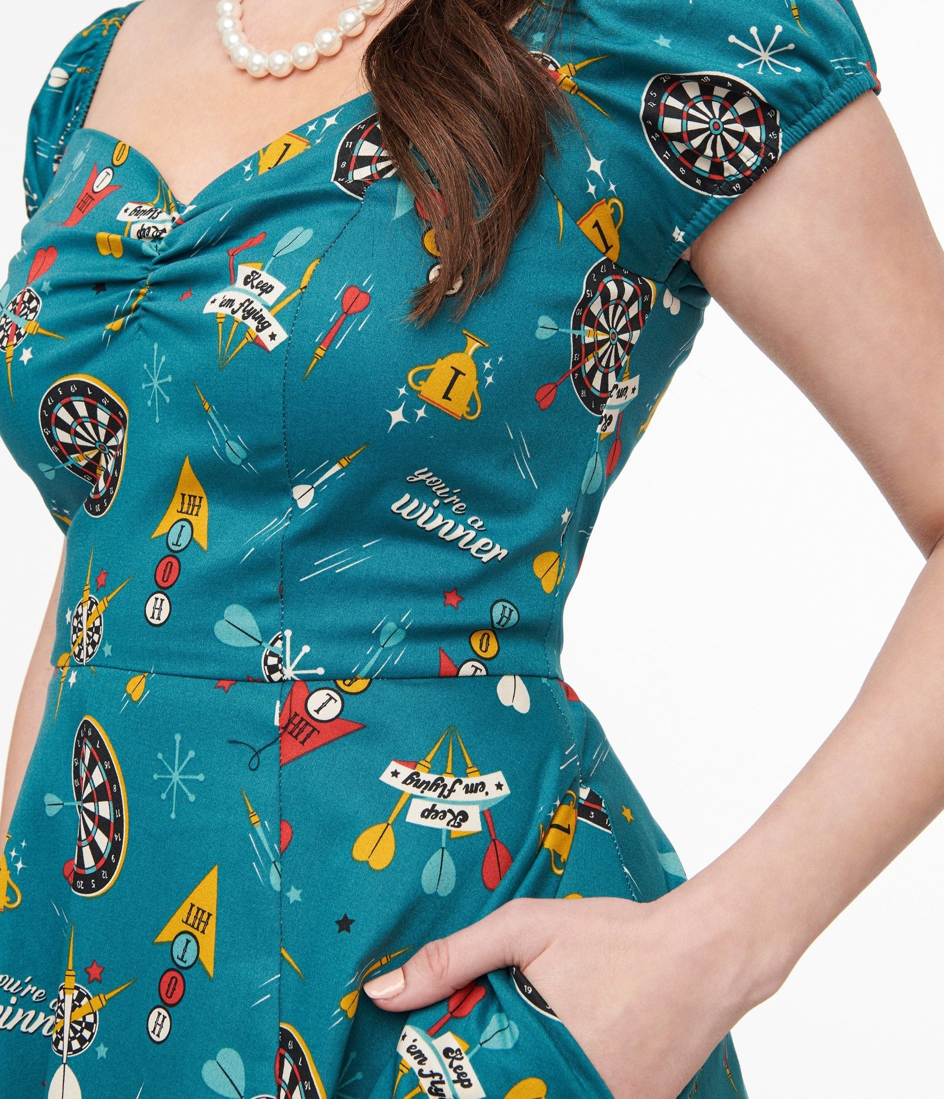 This teal colored 1950s style beauty features a unique dart board print with inspiring words like "Keep Em Flying" and "You're A Winner" scattered throughout. With side pockets for convenience. elastic shoulders and cuffs for comfort. and a flattering sweetheart neckline - this dress has it all! The short sleeves and back zipper add an extra touch of style.