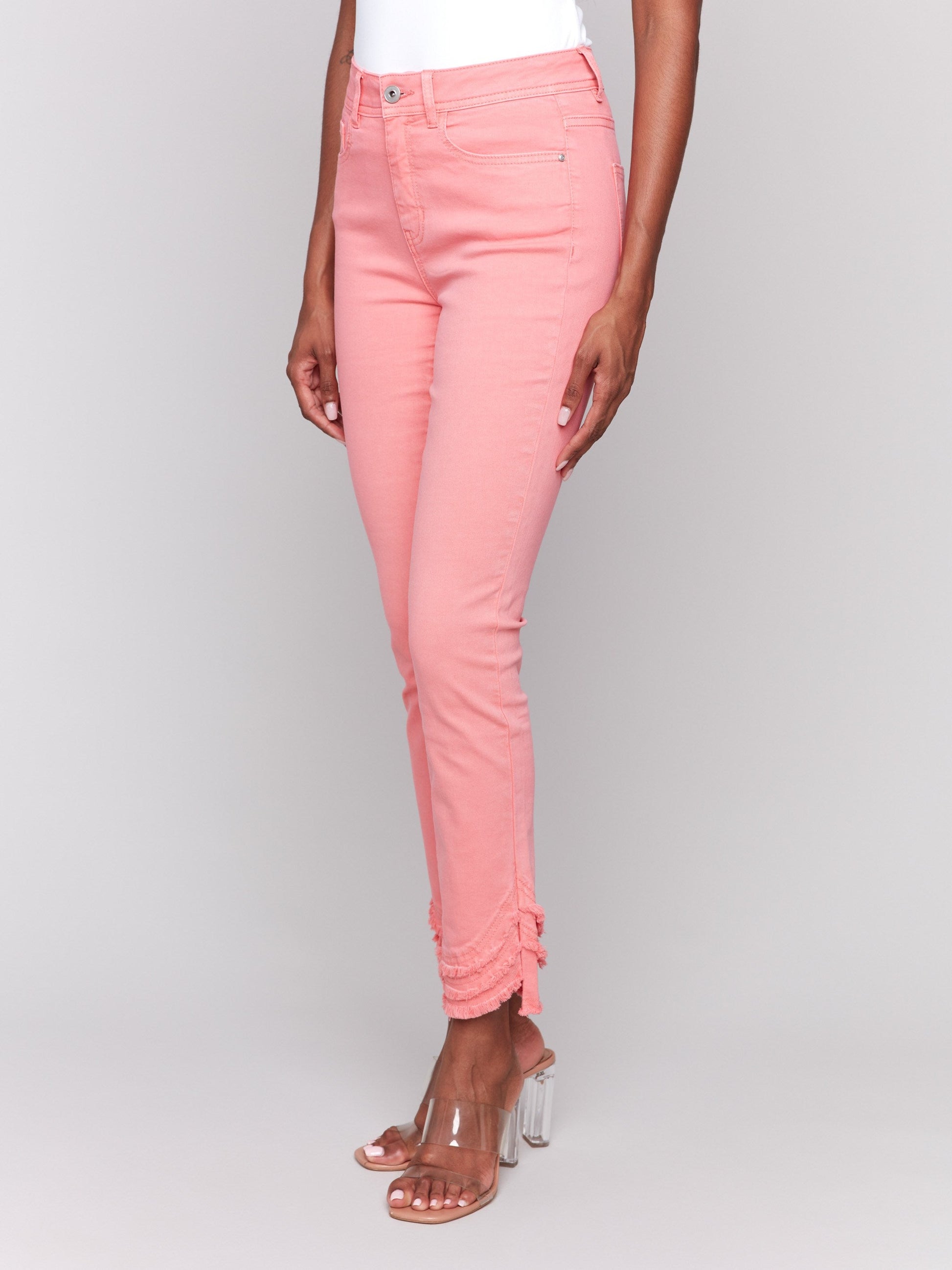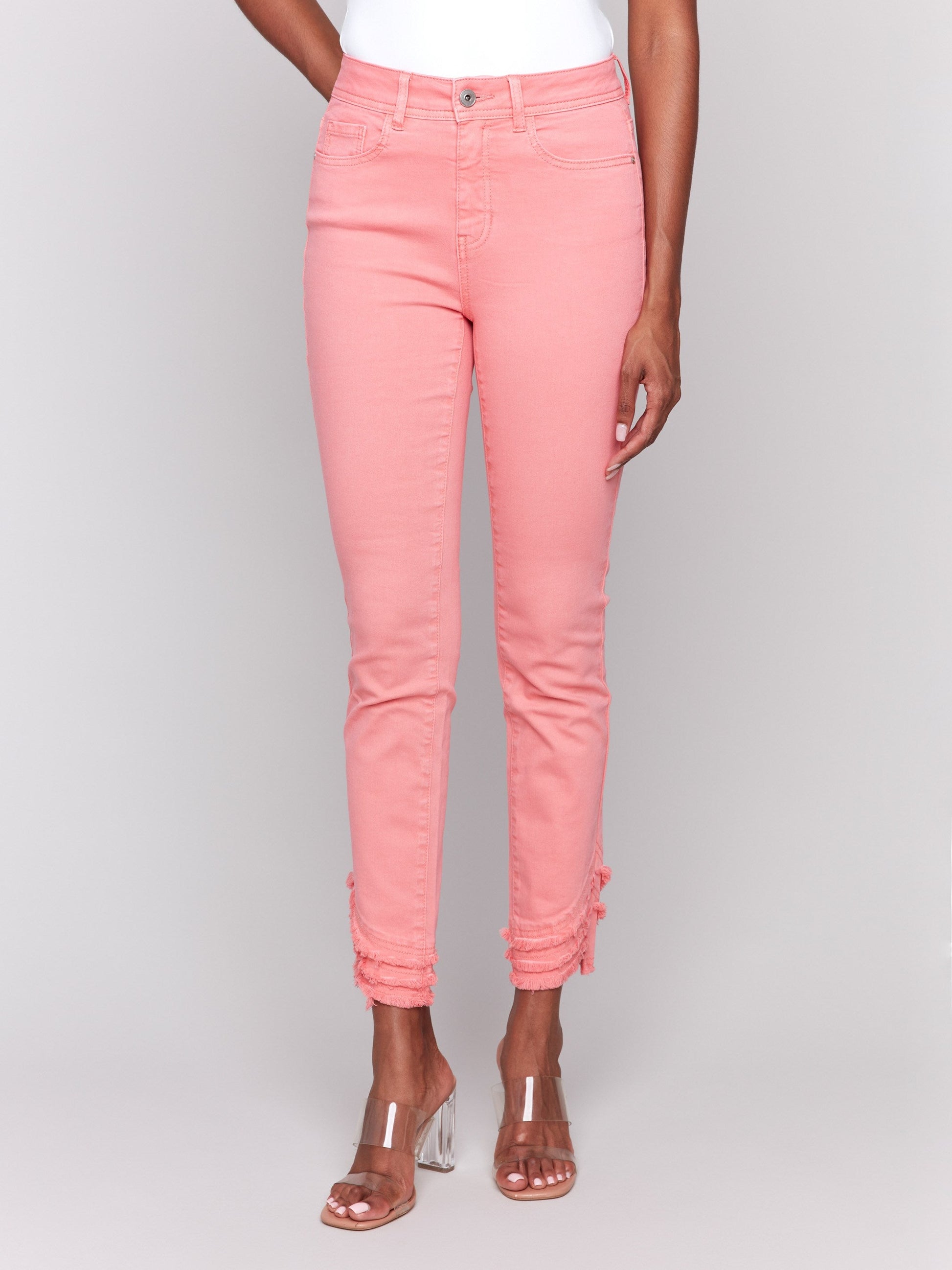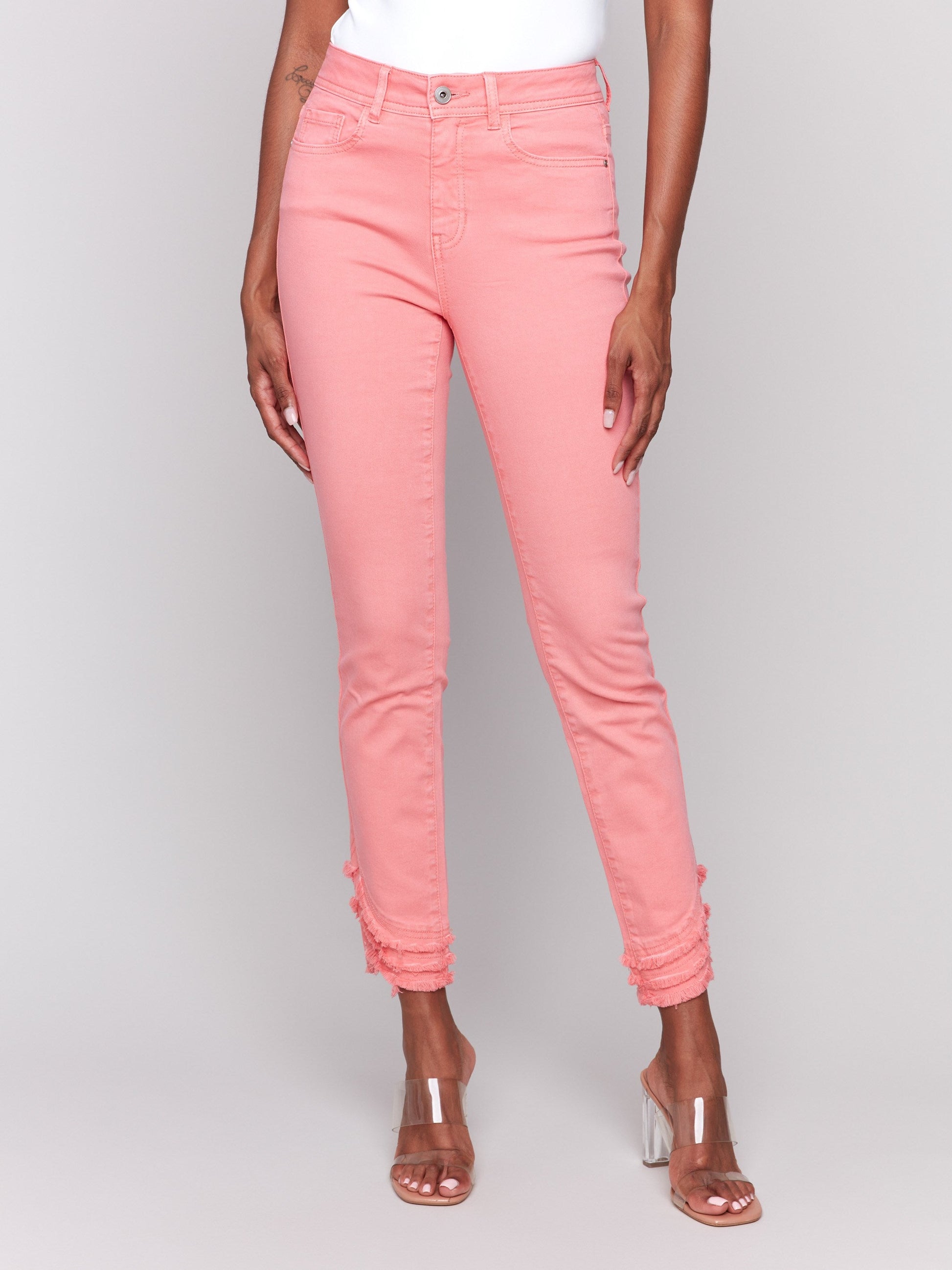 Step into style with these vibrant watermelon pink colored twill pants! The frayed hem adds a unique touch. perfect for those who love a hint of edge in their spring wardrobe. These ankle-length pants feature a comfortable stretch. making them a fabulous choice for any occasion. The mid-rise and slim fit create a flattering silhouette. guaranteed to make you feel stunning every time you wear them. Pair with your favorite top and let these pants speak for themselves.